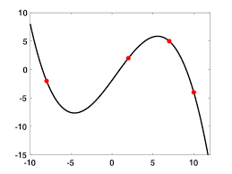 It is clear that the underlying function we are looking for is not a polynomial, namely it is a line. However, there is no exact line which perfectly goes through all of the points. This is likely because the data is noisy, and error was introduced when measuring the data. In this case, we deploy regression techniques, specifically linear regression.