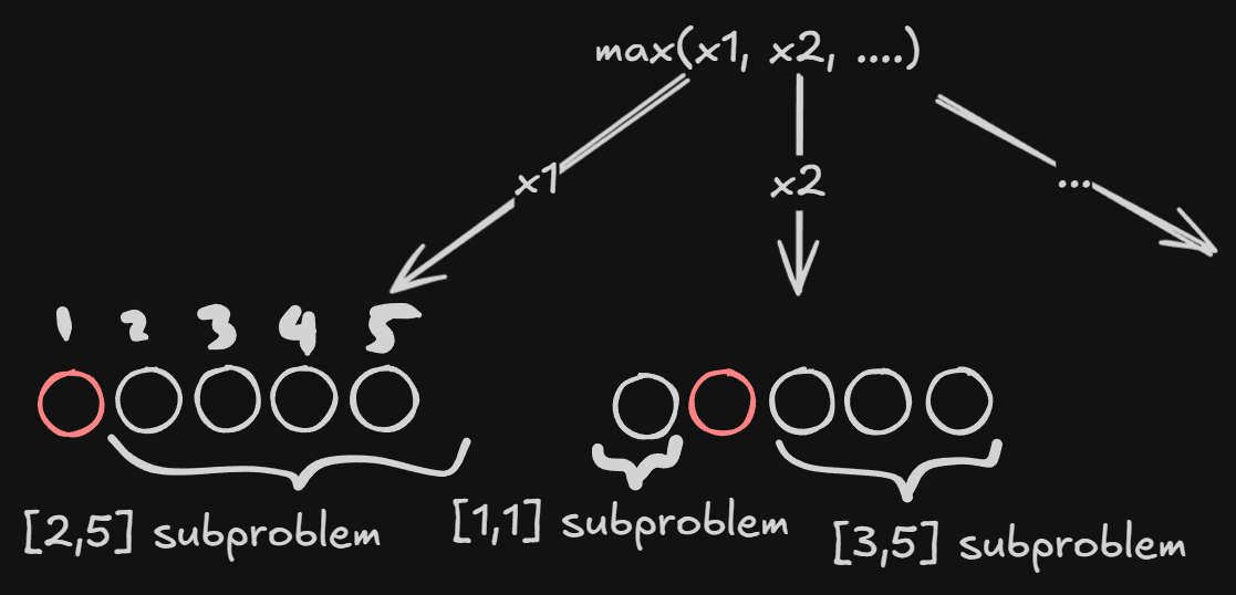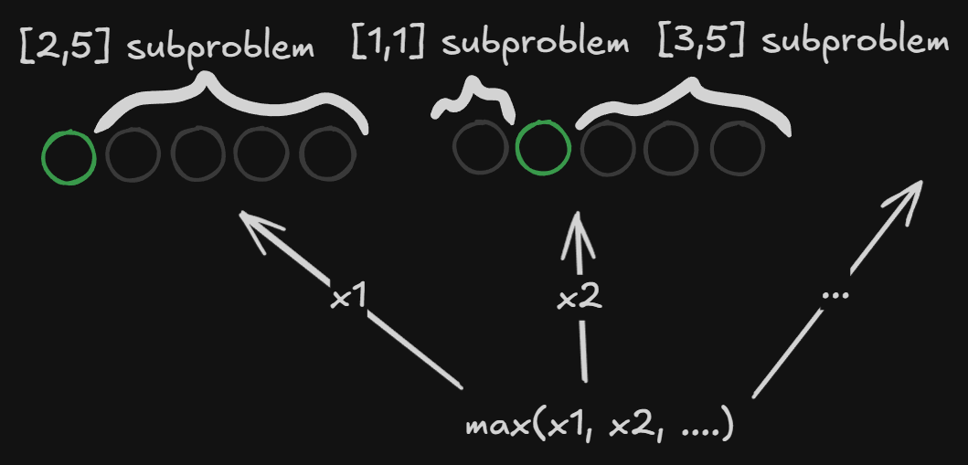 Notice how now, the [1,1] subproblem and the [3,5] subproblem are truely independent, as we know that balloon 2 exists. This way, when we revive the 1 balloon, we know that the score must be (switched to 0 indexing again 🙂), regardless of what happens in the [3,5] subproblem.