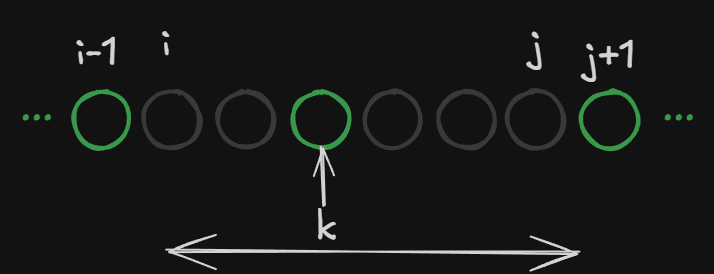We let to be the solution to the subproblem given all balloons and (namely ) are already revived. In particular, we actually don't care if all of and are revived, as long as and are revived, the score only depends on the immediate neighbors of the range being revived. I only force ALL the balloons to be revived because it is easier to think about the problem this way. I mention this because it is important to realize that we aren't only considering subproblems with contiguous outside ranges, and that's where most of the sparse cases are hiding.
